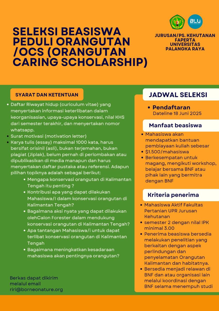 SELEKSI BEASISWA PEDULI ORANGUTAN / OCS (ORANGUTAN CARING SCHOLARSHIP)